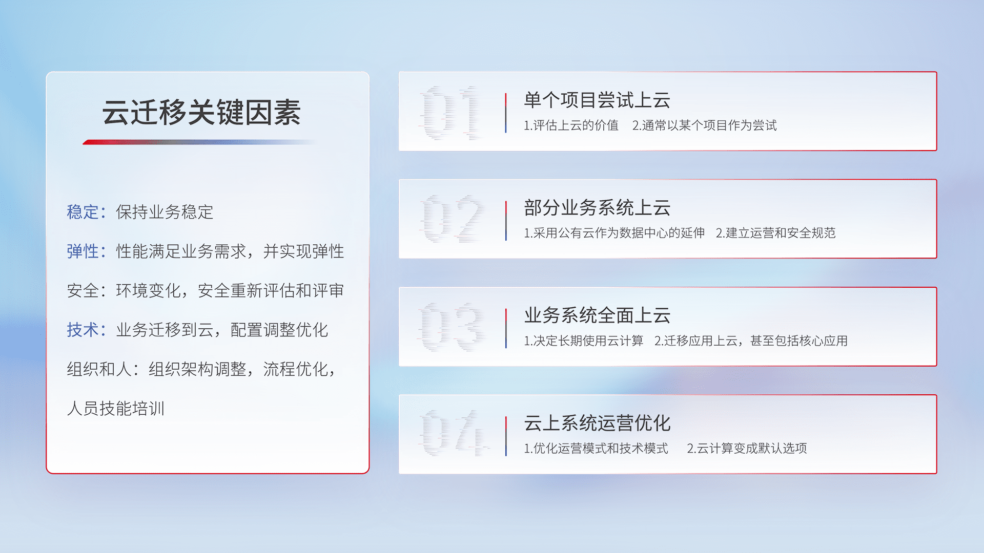 结合实际业务,,从规划设计、、、、云平台选型、、云原生改造、、、、数据迁移、、集成交付,,迁移全过程为客户识别最佳上云路径,,,做好风险识别管理,,,,设计网络架构、、身份权限、、、安全审计合规、、操作审计、、、、日志审计、、、监控告警策略、、、多站点容灾设计等,,,,对云上基础设施进行整体规划,,,提升IT治理水平,,,以满足弹性、、、、高可用、、高性能的需求。。