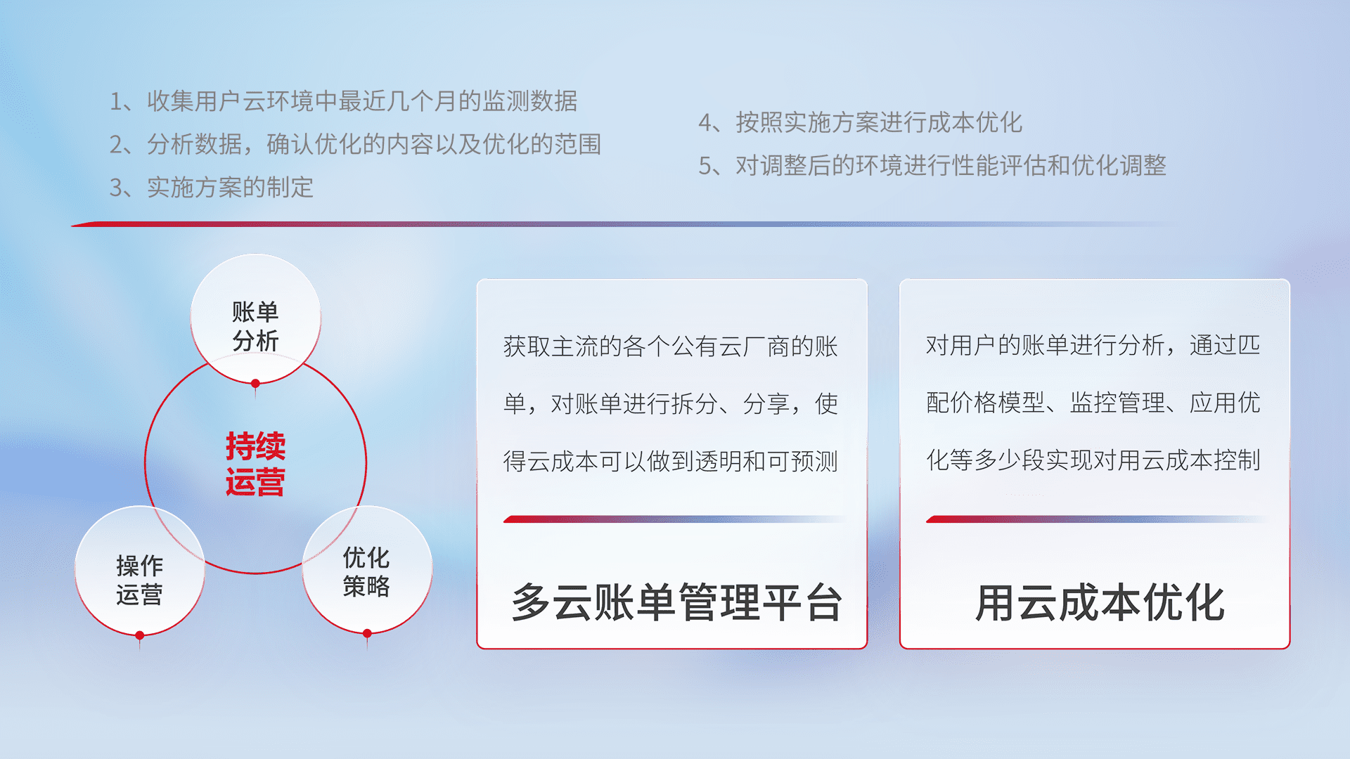 通过多云纳管,,以统一的资源数据模型把客户的云资源进行抽象和封装,,进而实现对多云资源的统一操作,,,,保障云资源管理的可靠性、、、稳定性与可用性。。量身定制化运维内容,,配置、、、开发运维、、、补丁管理、、备份、、、监控、、、、认证和访问管理、、审计和日常巡检等,,,,保障在用云过程中的可靠度,,稳定度以及高可用率。。。。